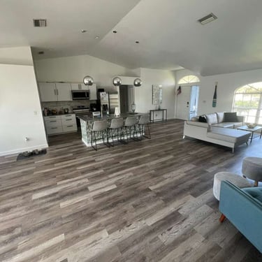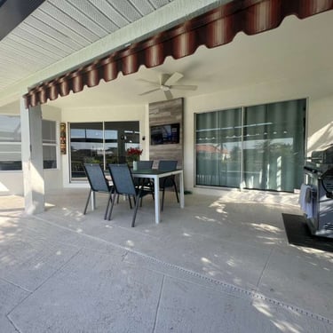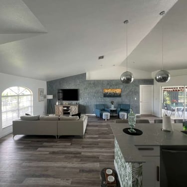 This stylish home features 3 spacious bedrooms and 2 bathrooms, comfortably accommodating up to 6 guests. The open-concept living area is bright and inviting, with large sliding doors that lead to the sunny lanai and pool area — perfect for relaxing, dining outdoors, or simply enjoying the tropical breeze.